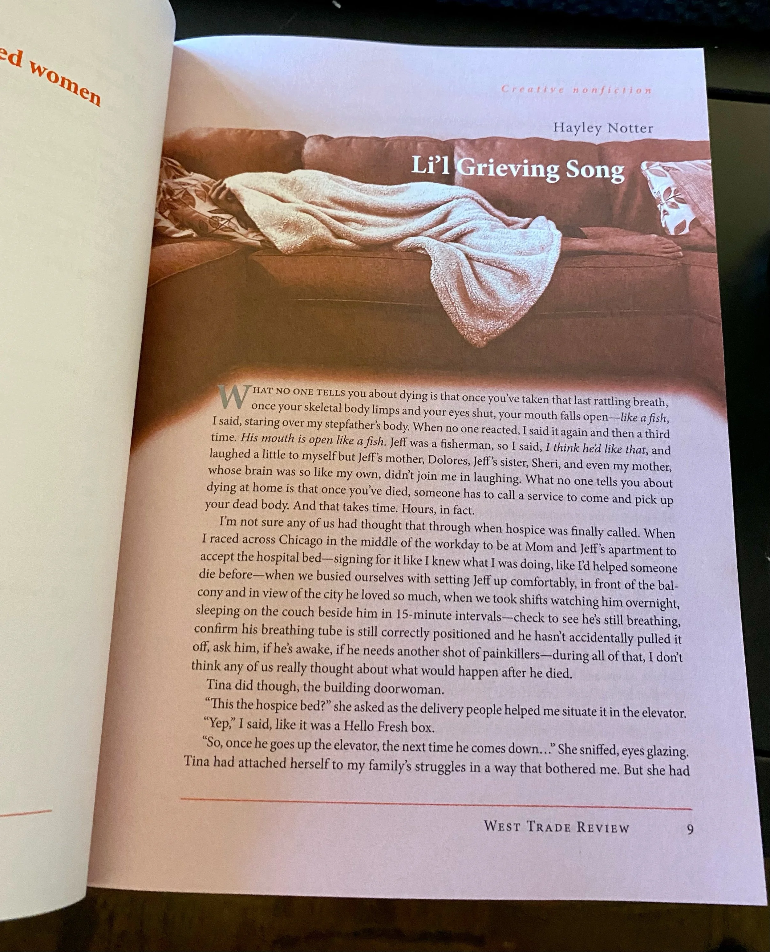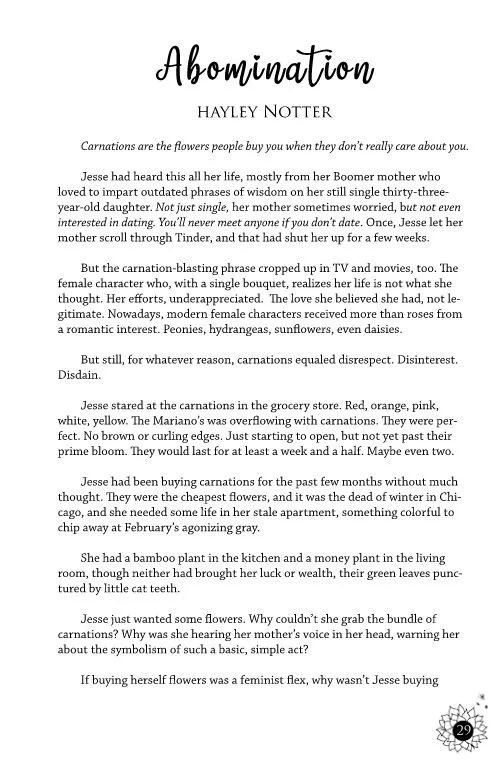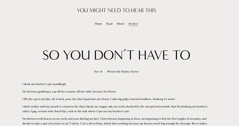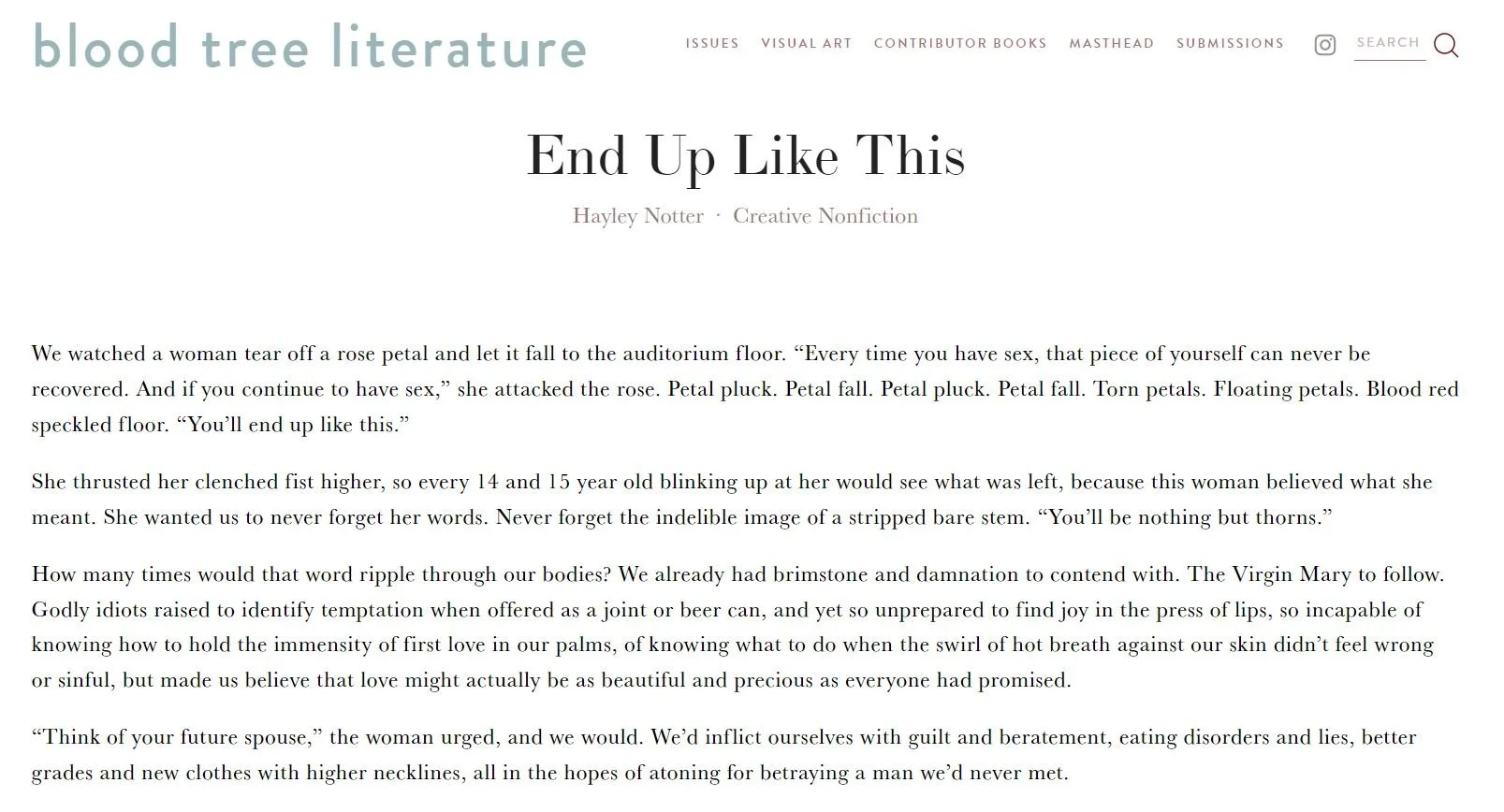 Nonfiction: Li'l Grieving Song Flash Nonfiction: Willpow(d)er Flash Nonfiction: End Up Like This Flash Fiction: Black Ice Flash Fiction: Abomination Nonfiction: So You Don't Have To Nonfiction: This Is My Body Given For You
